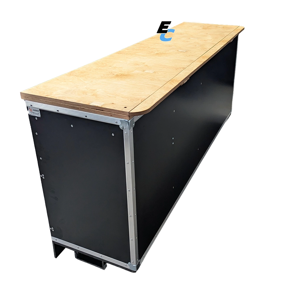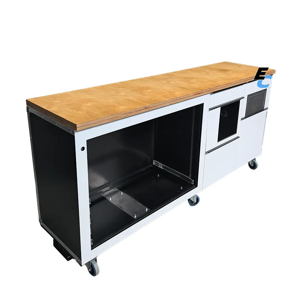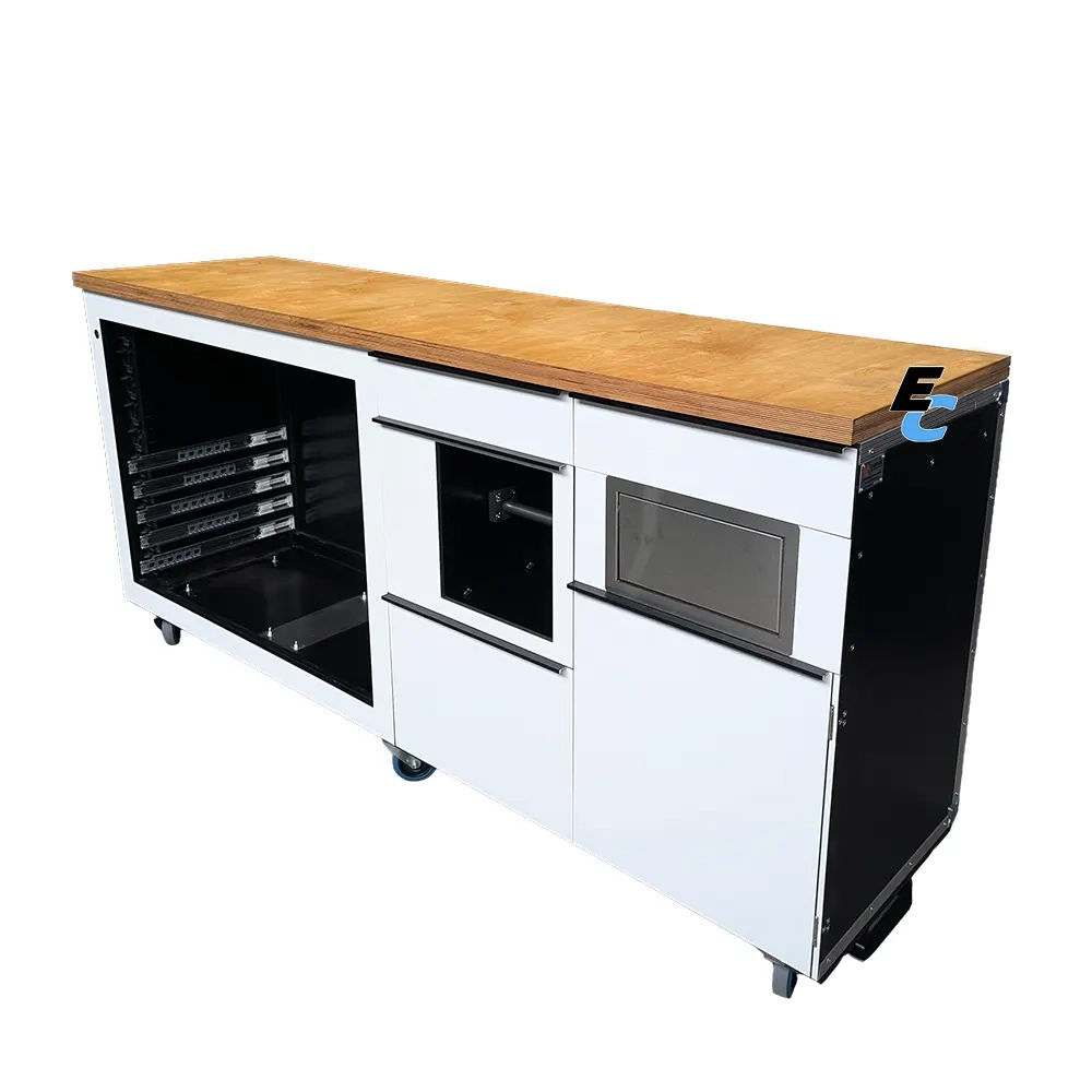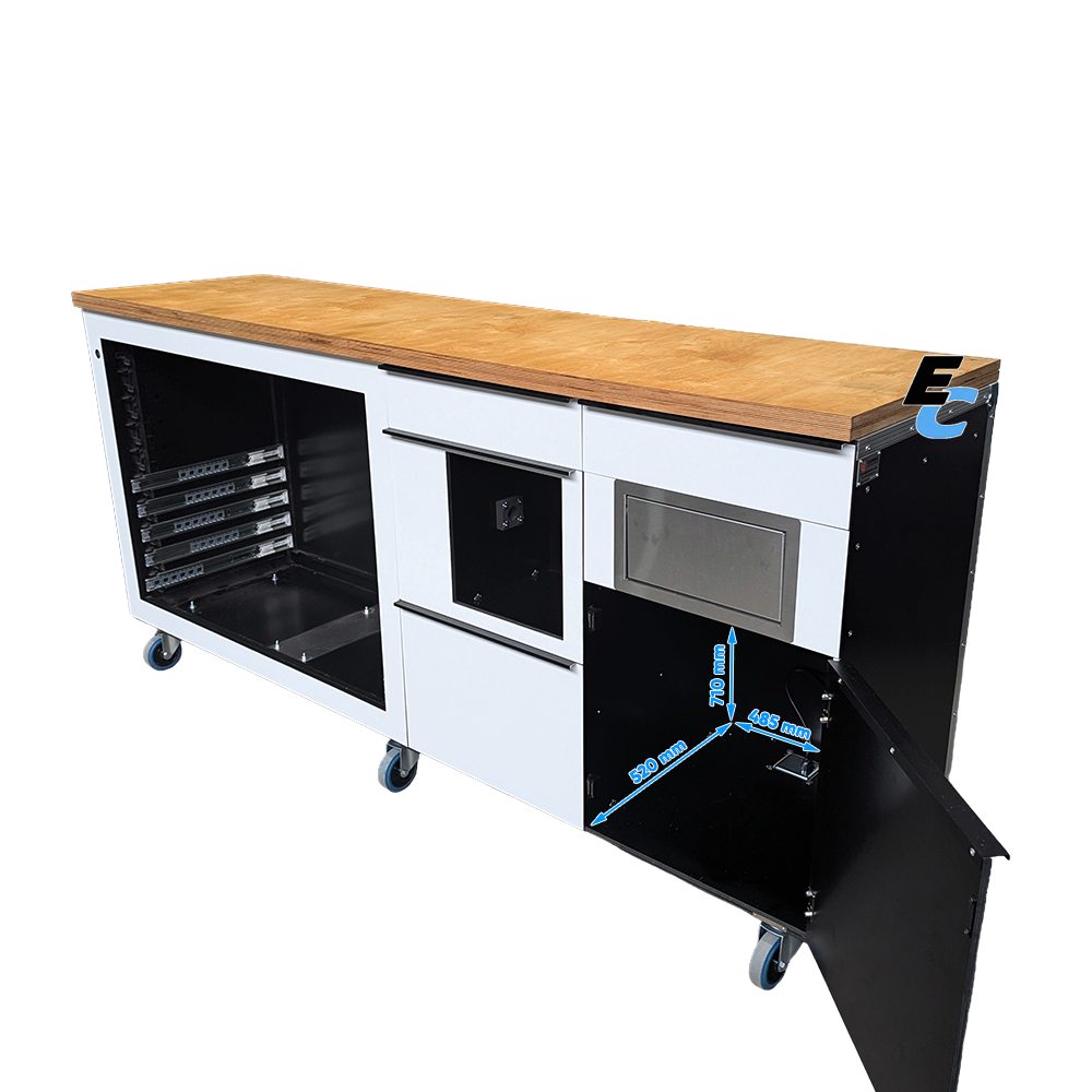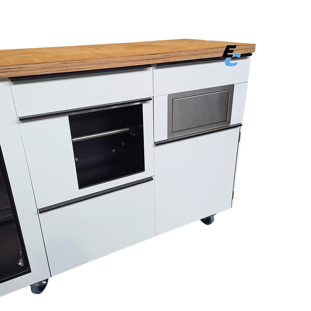 Pensée pour l’efficacité logistique, elle intègre des rails d’organisation, des tiroirs de précision, ainsi qu’un système astucieux pour l’hygiène et les déchets (tiroir essuie-tout et trappe poubelle).
