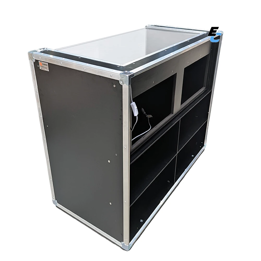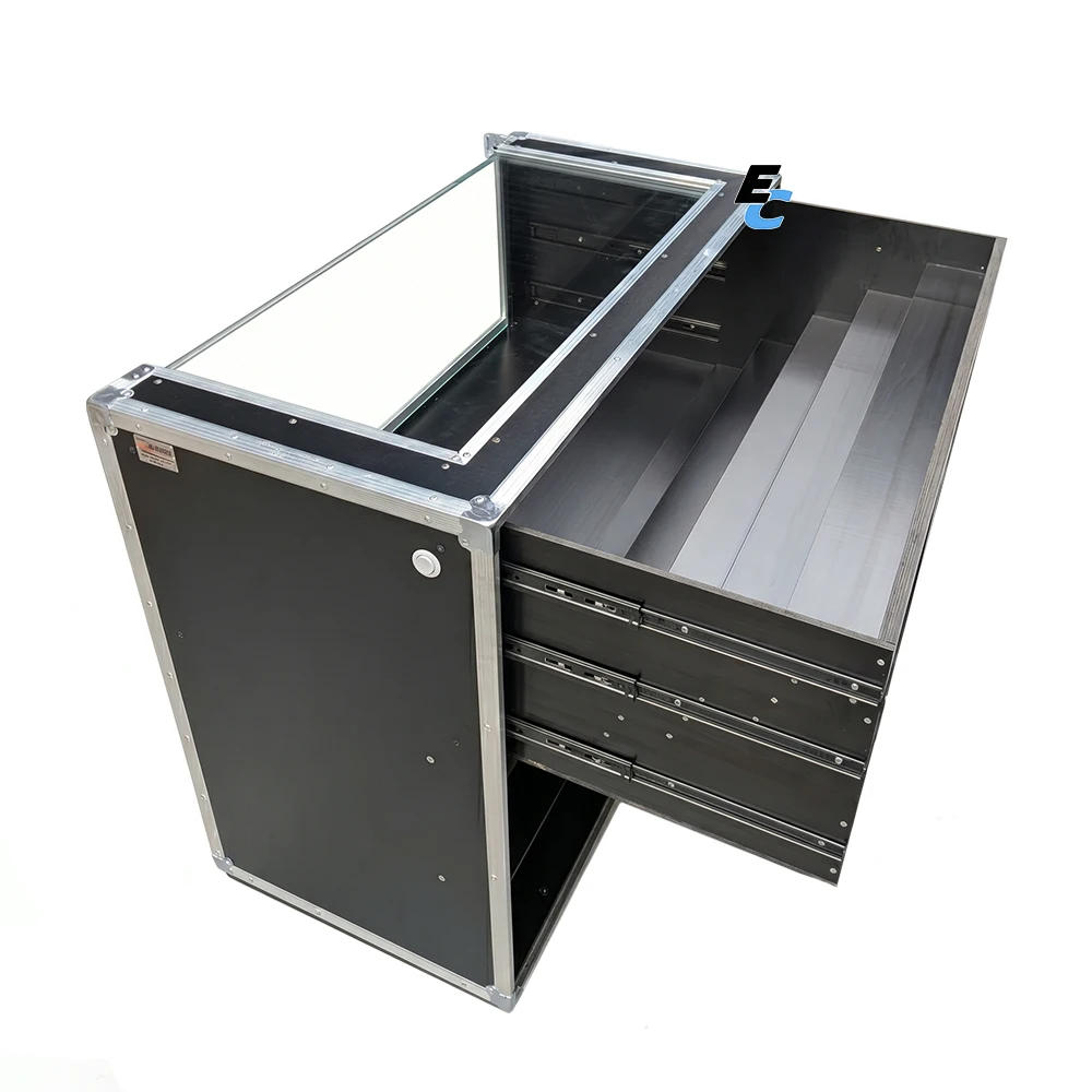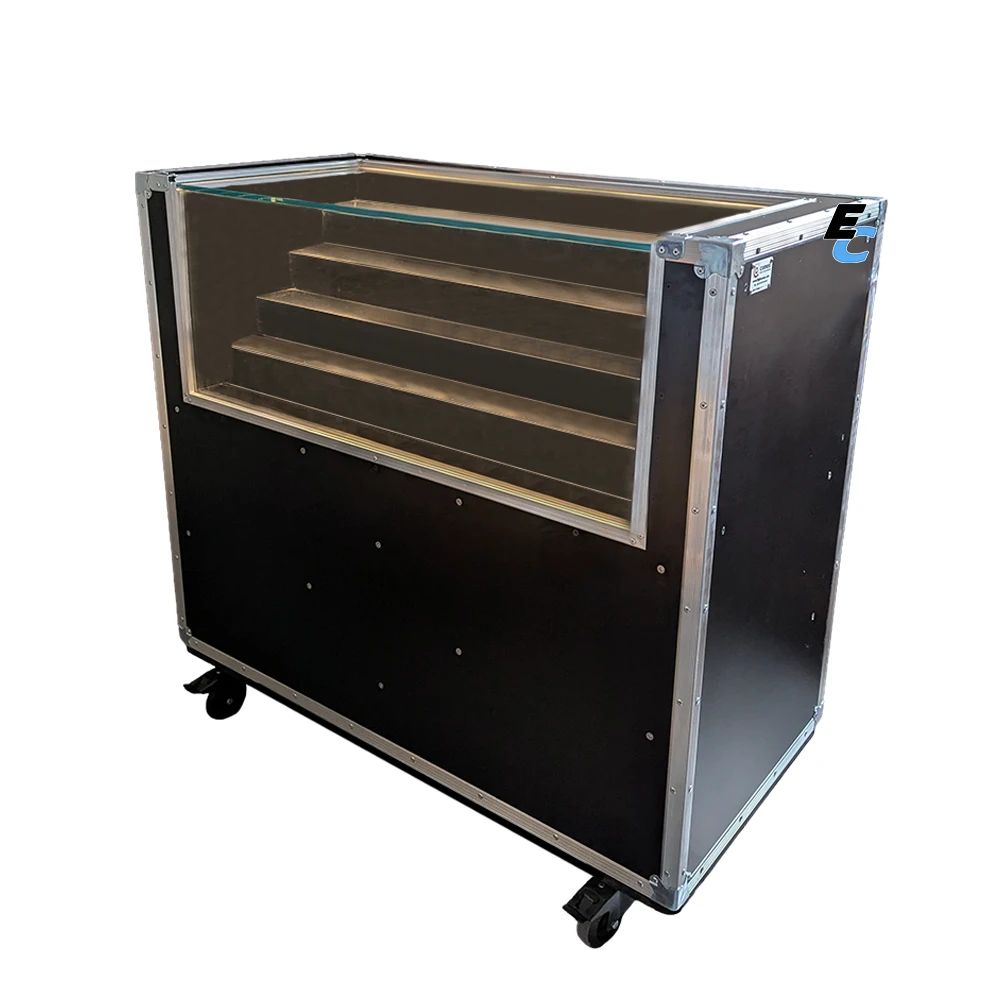 Flycase d’exposition à gradins – Une structure originale intégrant un accès arrière coulissant et des LED, parfaite pour mettre en avant vos articles tout en assurant une sécurité absolue via ses cloisons masquantes.