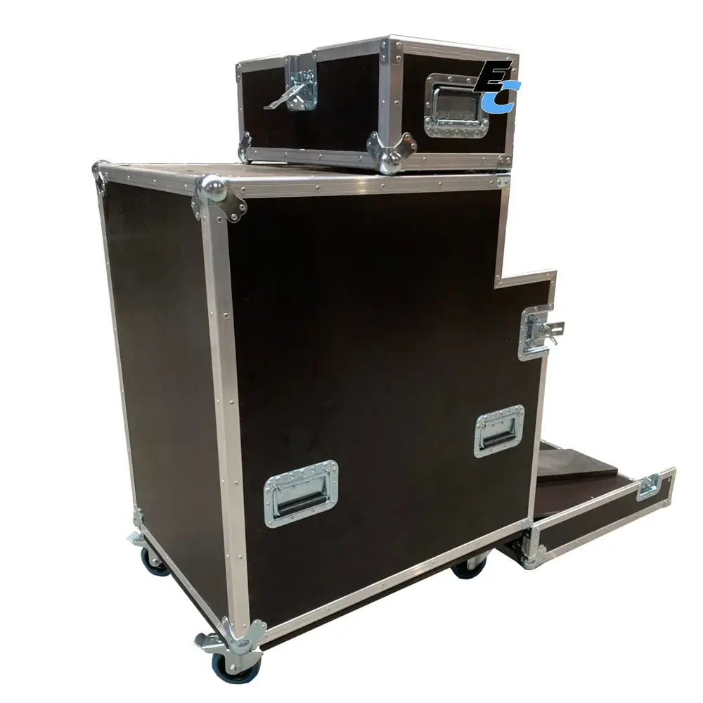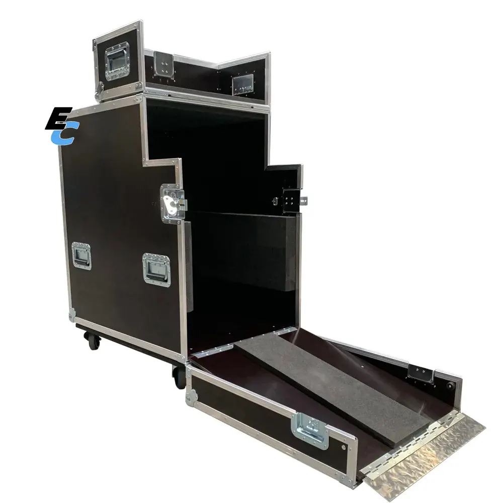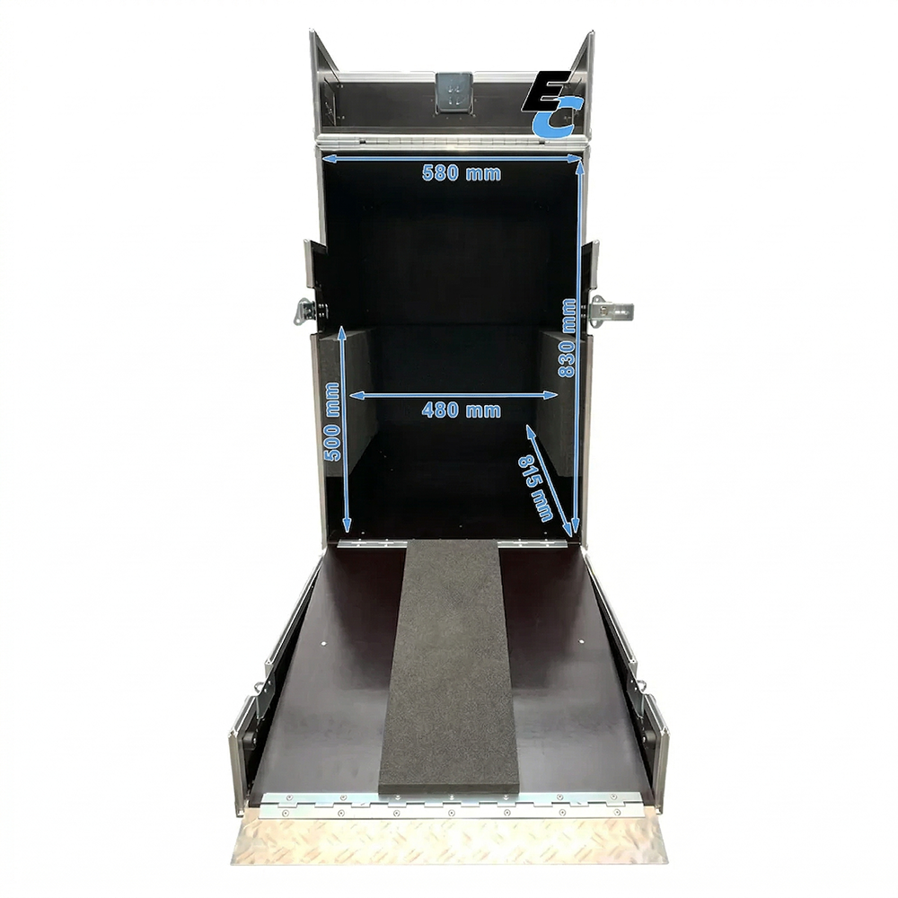 Construit en contreplaqué avec film phénolique et capitonné de mousse, il agit comme un véritable flight case antichoc pendant le transport. Pratique et ergonomique, sa face avant se déploie pour former une rampe de chargement de plus d’un mètre, permettant une manutention sans effort de vos équipements lourds.